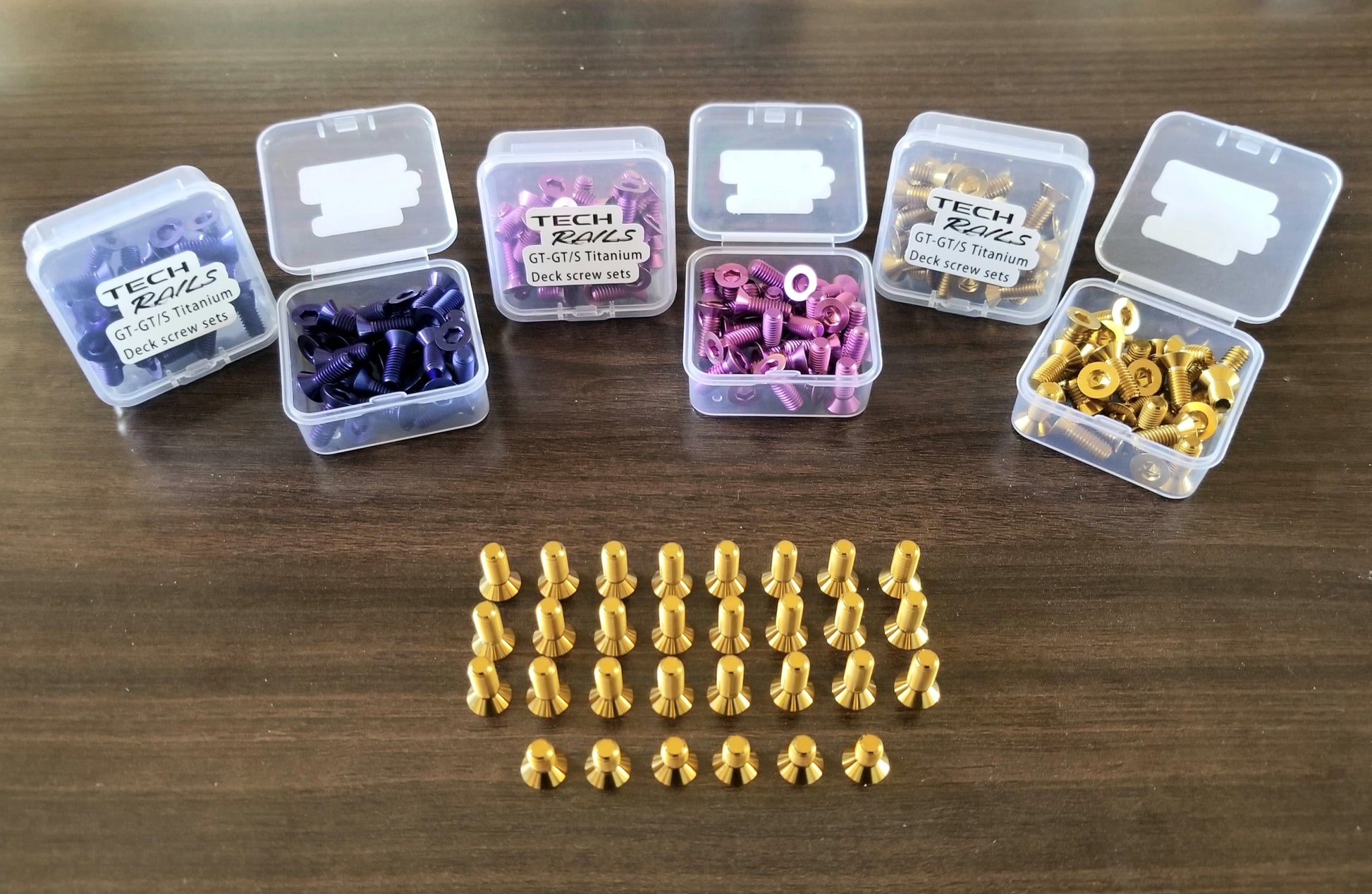 This is a complete set of Titanium screws for the "Deck" of the GT. It includes all foot footpad, bumper, and fender screws. There are 30 screws in total in this kit. These screws use an Allen key instead of the stock Torx style head for easier use. These are a wonderful complement to our titanium axle bolts and titanium wheel cover bolts (sold separately). These titanium screws are as strong as steel and half the weight, and they look FANTASTIC! Now in multiple color options!